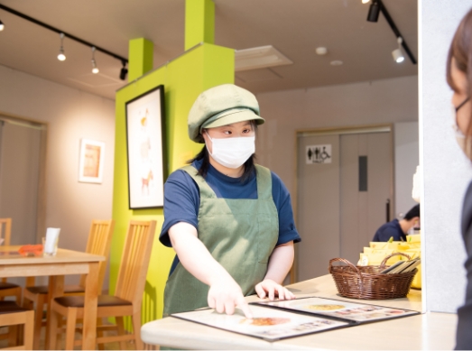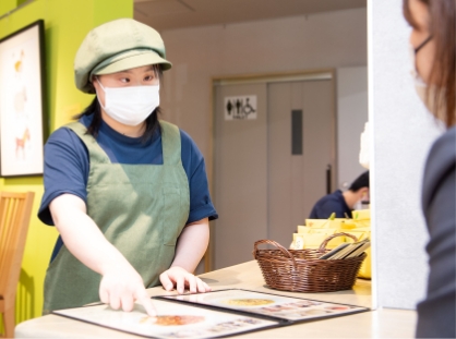 地域との接点をつくり、利用者さんの働く機会を提供しています。「おおくぼテラス」「ふらっぐ」などのカフェ運営では、接客や調理を通じて社会参加を促します。また、「みるく」を中心に、作業訓練と資源リサイクルへの貢献を兼ねた空き缶回収なども行っています。