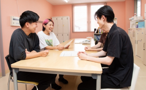 未経験でも安心してスタートできる充実した育成体制を整えています。1年目は基礎研修から始まり、その後は現場でのOJTを中心に実践的なスキルを身につけます。配属を決めるのは2年目からで、1年間は様々な拠点で幅広い経験を積みます。障がい特性への理解を深める専門研修のほか、3年目以降は専門性を高めていける研修プログラムも用意されています。また、年齢の近い先輩職員によるメンター制度を設けているので、困った時はいつでも相談できる環境です。