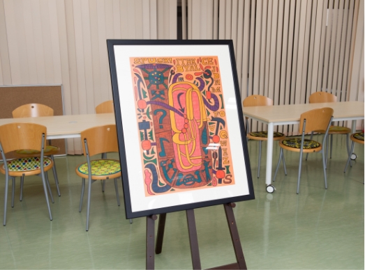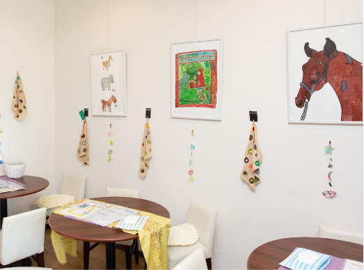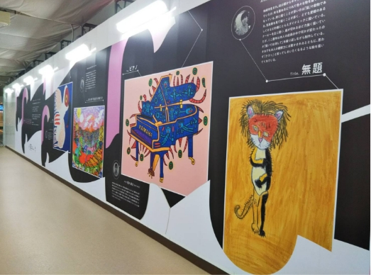 利用者さんの豊かな表現力を社会に発信する芸術活動です。絵画作品の展示やレンタル事業を通じて、障がいのある方の才能を発信しています。作品評価が利用者さんの自信につながり、収入は本人に還元される仕組みです。現在は利用者さん3名が作家として描いた絵を市内企業にレンタルしたり、乗り合いタクシーなどの広告デザインなどに使ってもらったりしています。